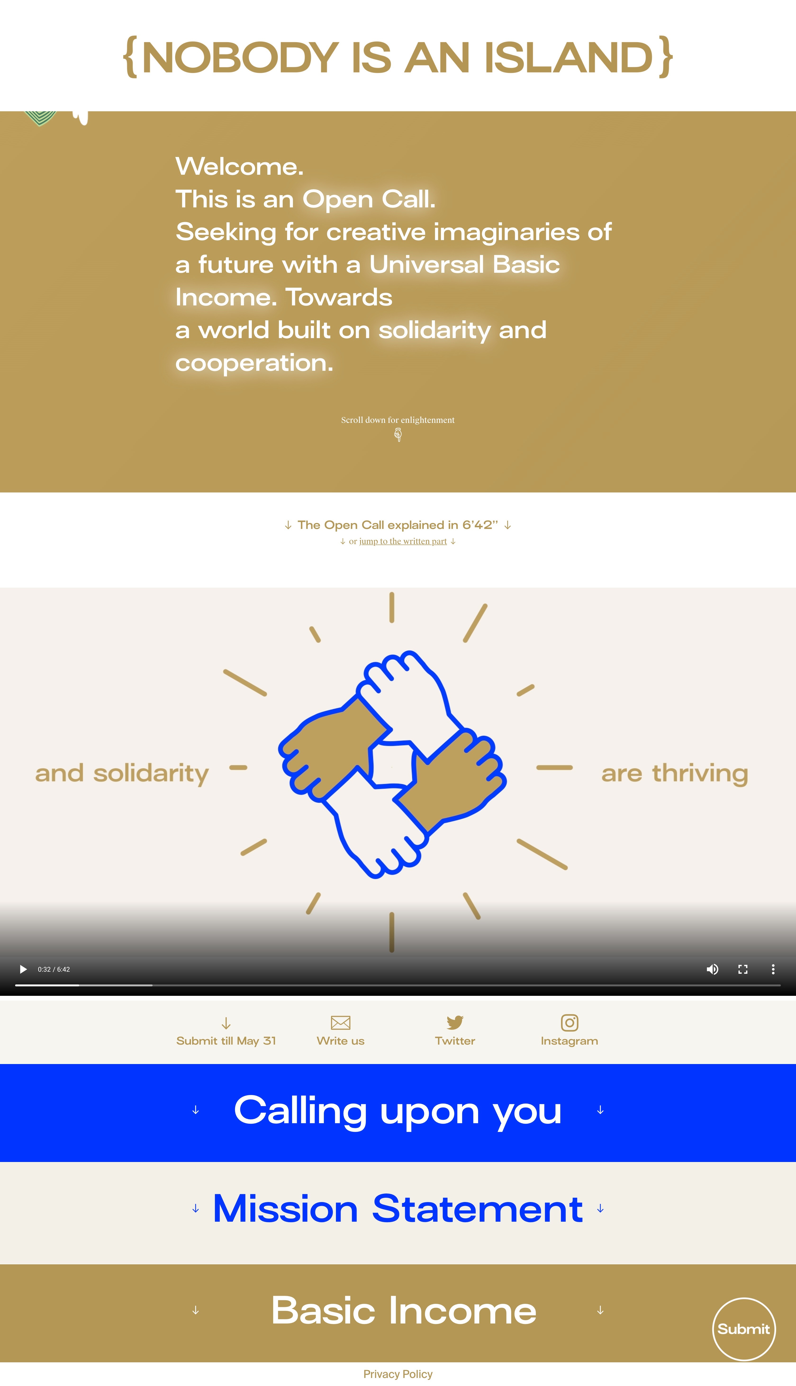 The master's thesis "Nobody is an Island" is an examination of the idea of a Universal Basic Income (UBI) from the perspective of art and design. In the written thesis, the idea of a Universal Basic Income is fundamentally examined, its importance and relevance for artists and designers is discussed and the master project "Nobody is an Island" – an open call about a possible future with a UBI – is presented. The Open Call was seeking for creatives to use their own artistic and creative methods to make the vision of a UBI more feasible and tangible. The submissions of the participants will be shown in an online archive (nobodyisanisland.cc) as well as in a physically accessible exhibition.