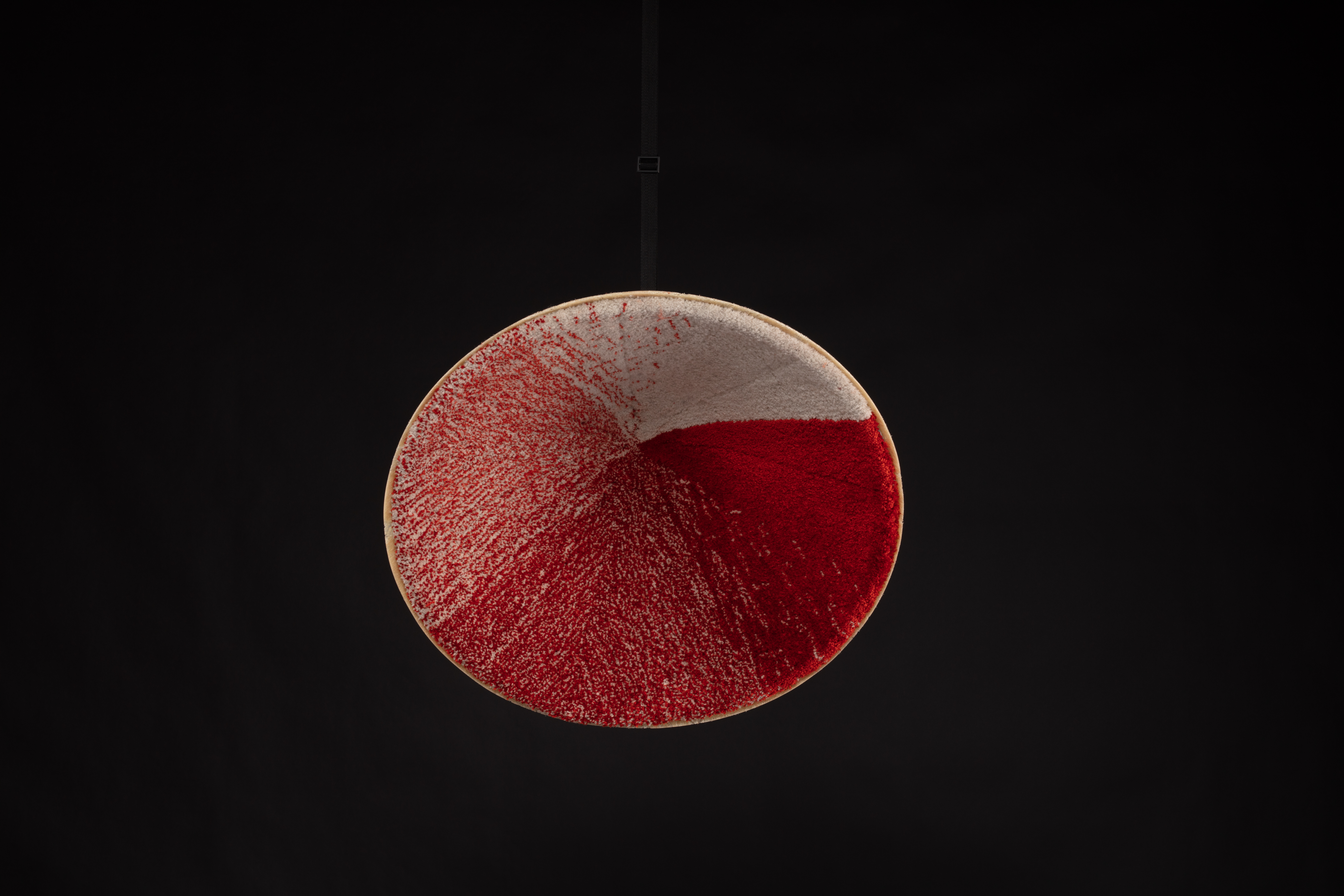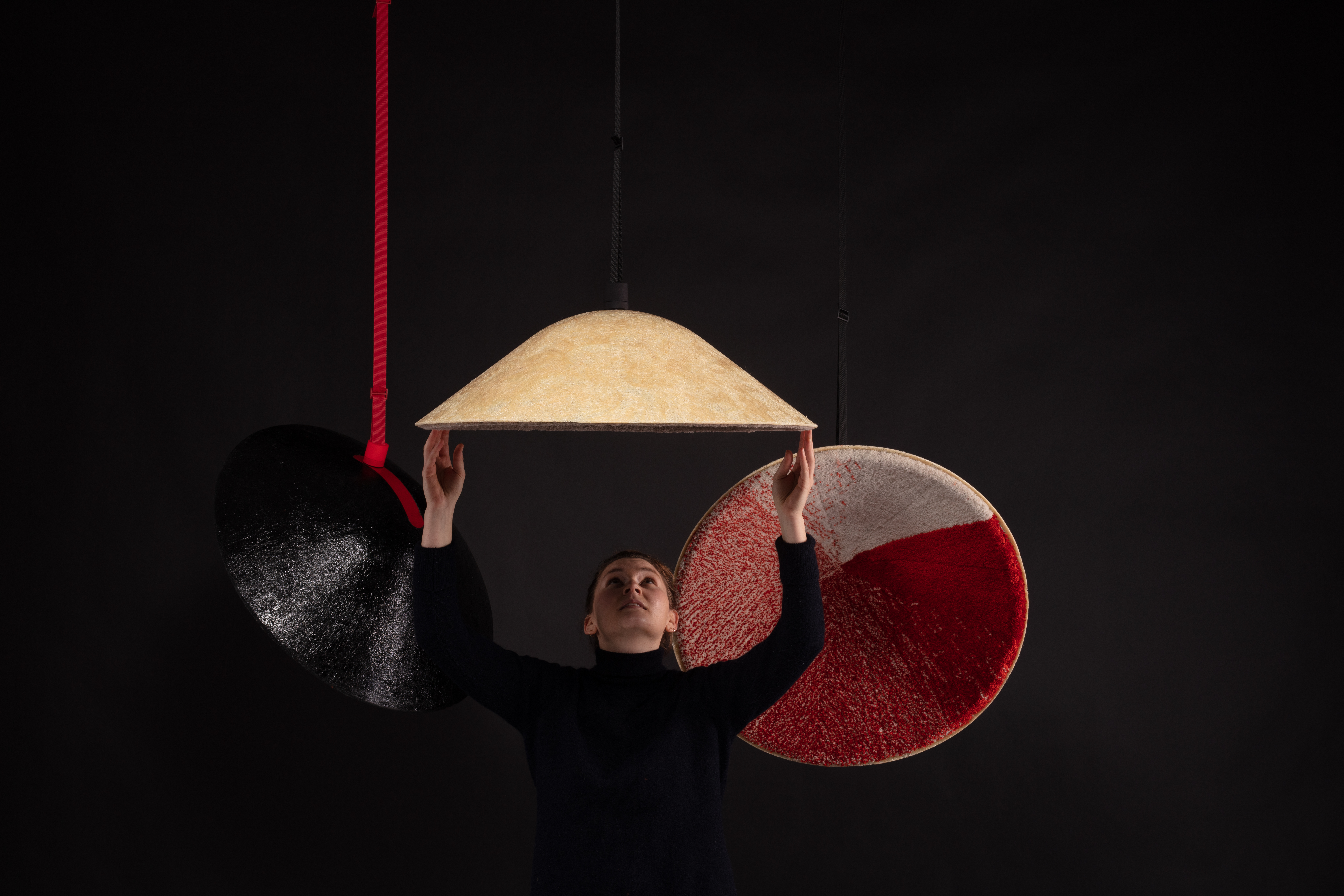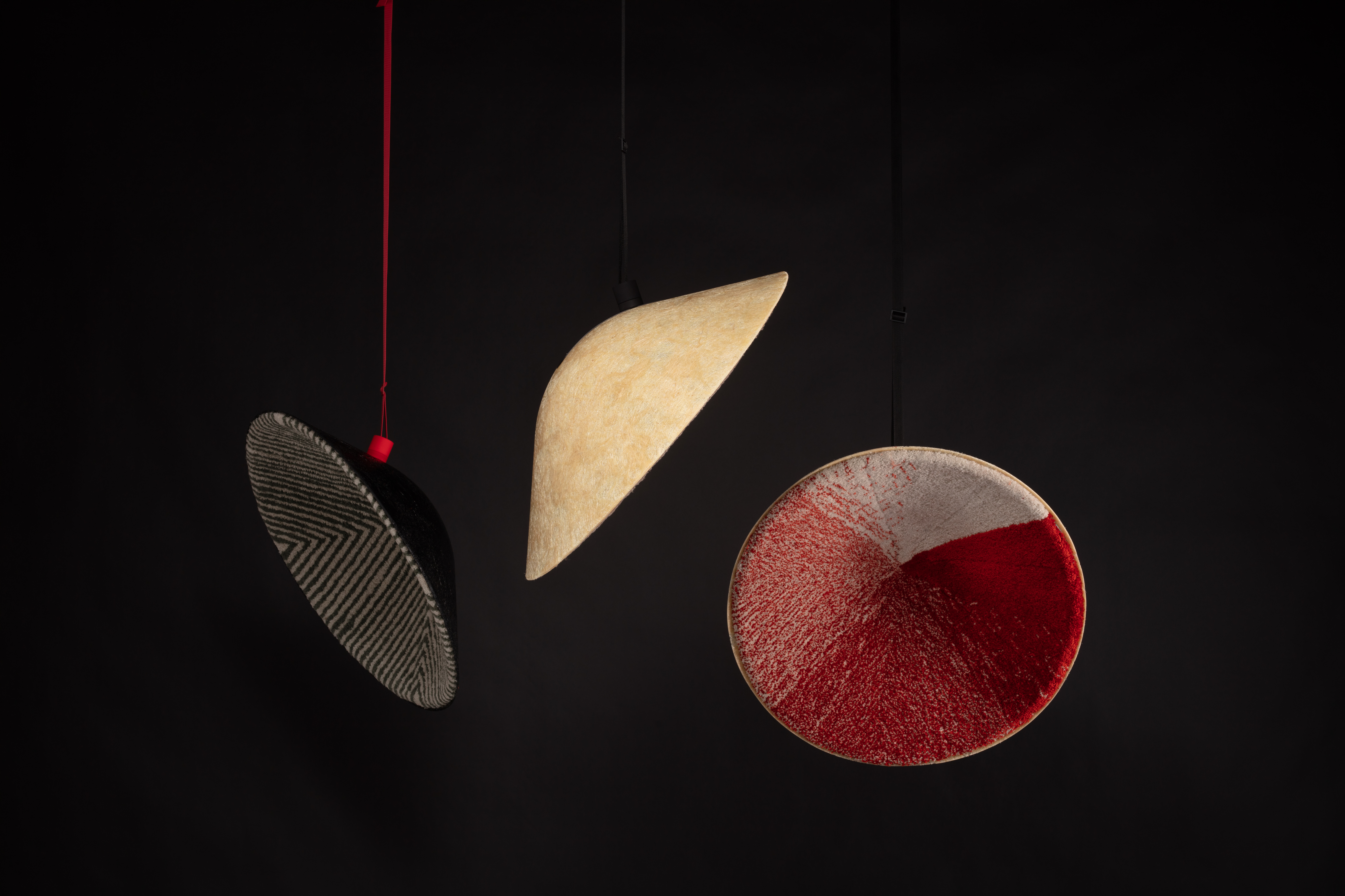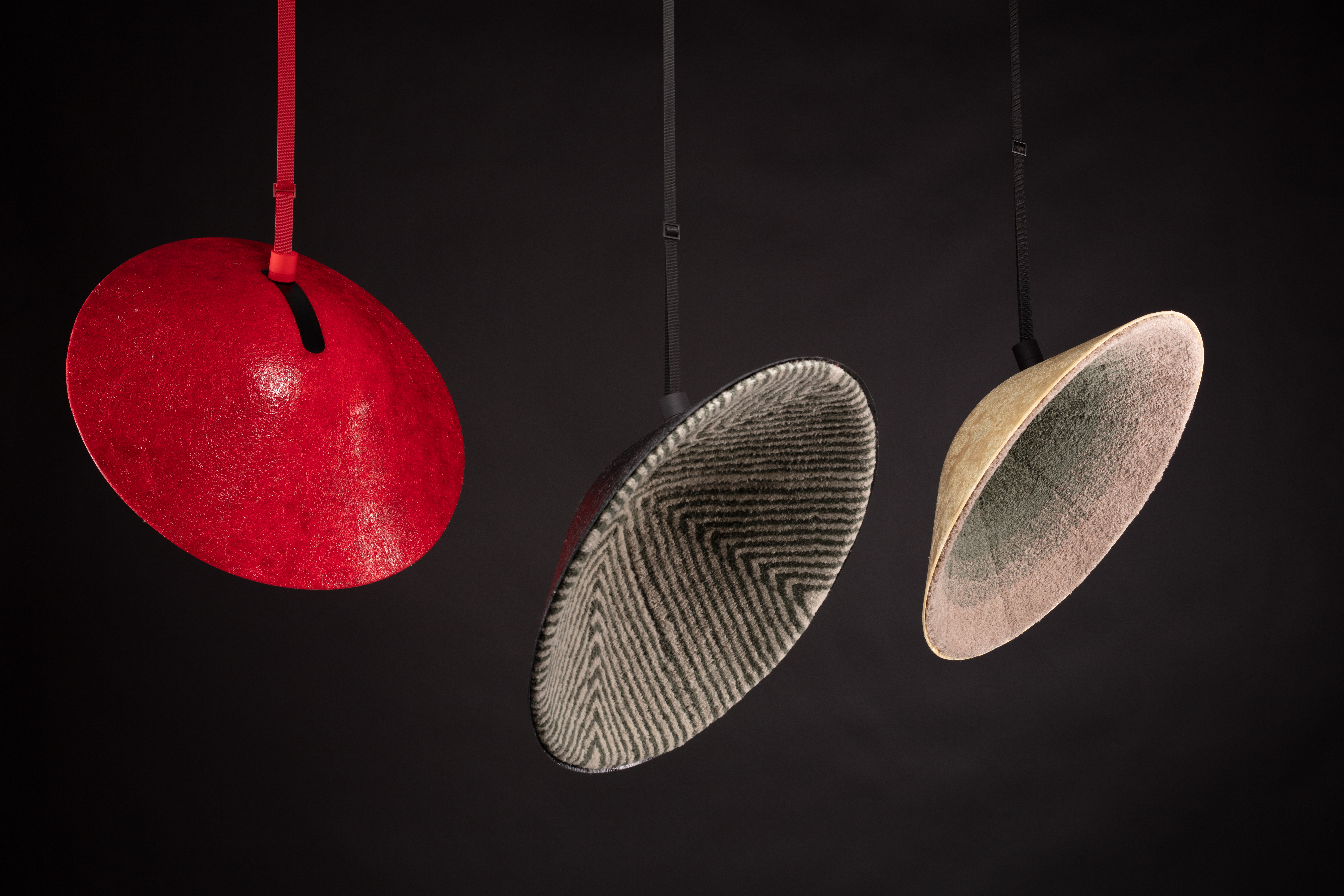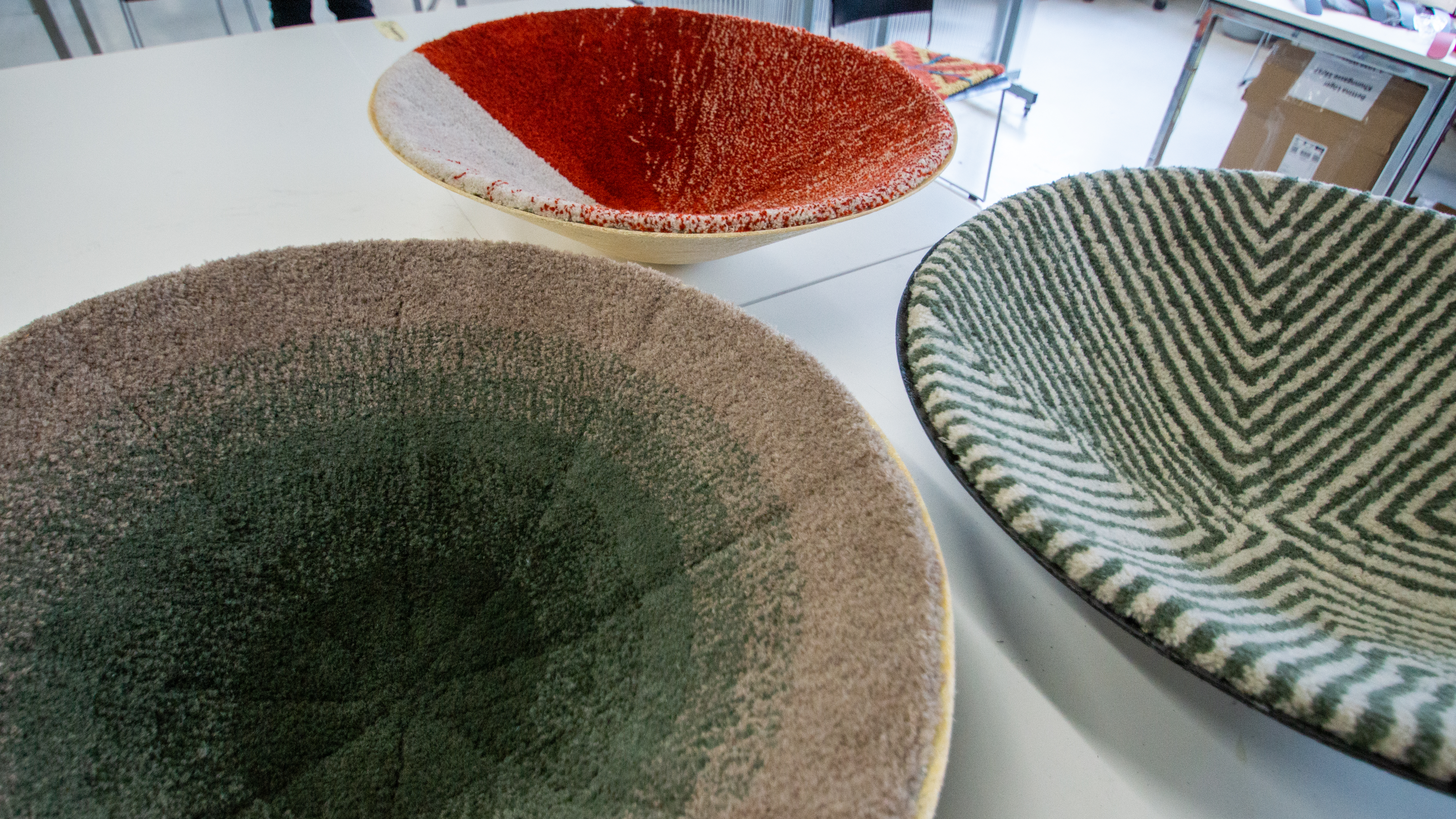 The Diploma „3D robots tufting“ was a material research and a progress of a new production method. The vision was to create 3D textile surfaces on 3D objects through tufting and the aim was that all the work would be done by a 6 axis robot to create an industrial production process. This new production method could offer an investigation for furniture industry. Parts of upholsteries and acoustic elements could be replaced through this new way of production. For the tufting process with the 6 axis robot a hand tufting gun was rebuilt and fixed on the robots arm. The tricky part of the project was to improve the tufting technique in three-dimensional space. Finding the right contact pressure, the ideal velocity of the tufting gun combined with the robot and many more factors had to be investigated to run production on the 6 axis robot.